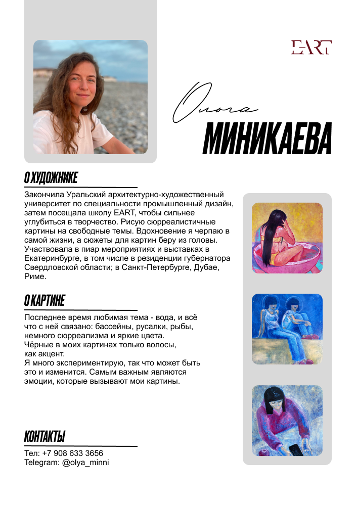 Я тоже приму участие в этом проекте — мои картины можно будет увидеть среди экспозиций. На открытии 3 октября запланирована живая музыка и уютная атмосфера творческой встречи.